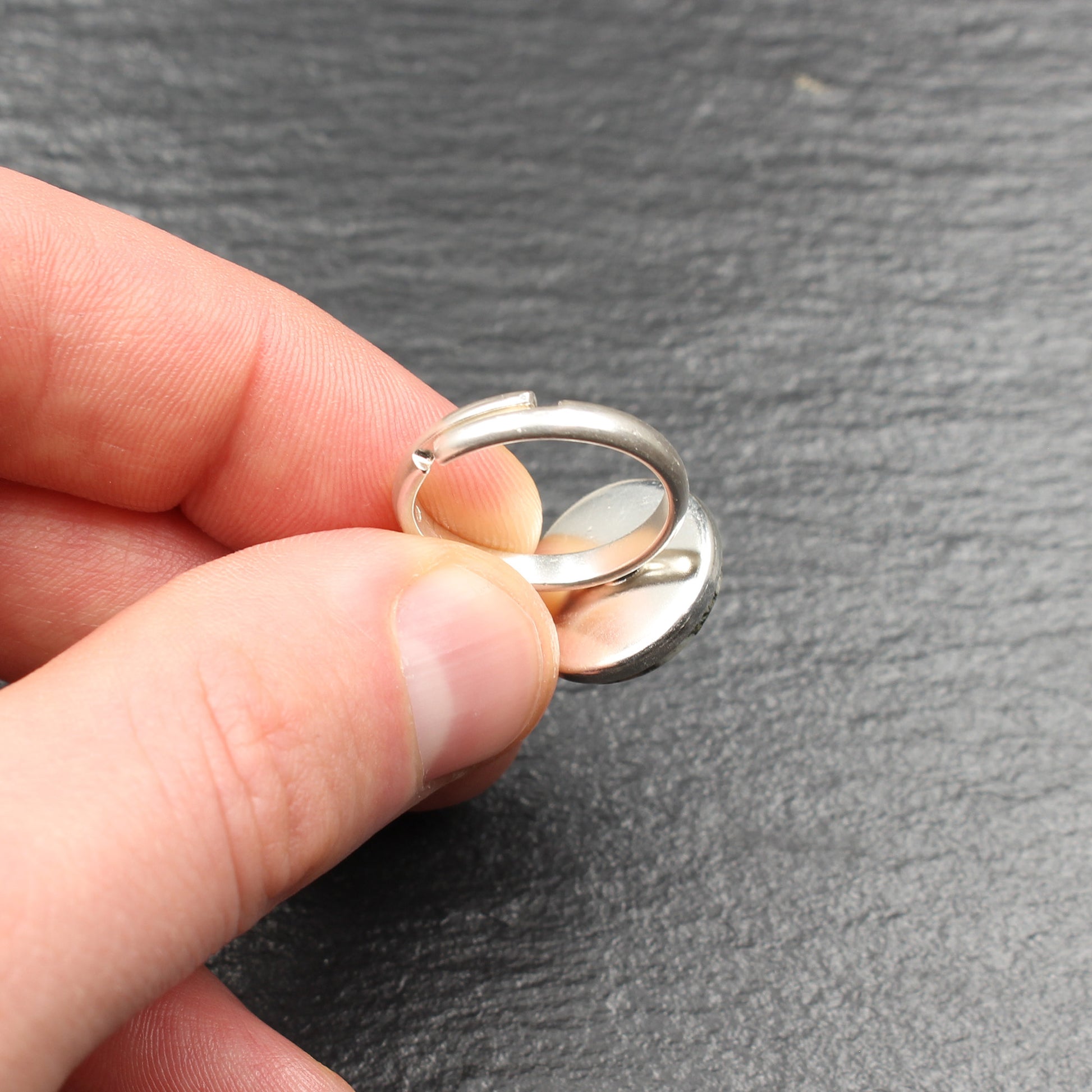 Ich fertige meine Ringe aus Mineralien und Edelsteinen mit viel Liebe zum Detail und in sorgfältiger Handarbeit in Deutschland. Jedes Schmuckstück durchläuft mehrere präzise Arbeitsphasen: vom Zuschneiden des Rohsteins über das Formen und Schleifen an verschiedenen Diamantschleifrädern bis hin zur finalen Politur.
