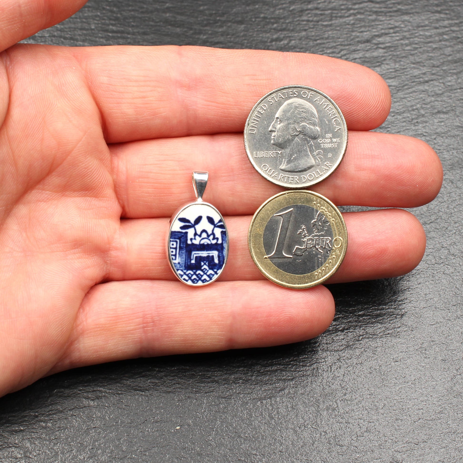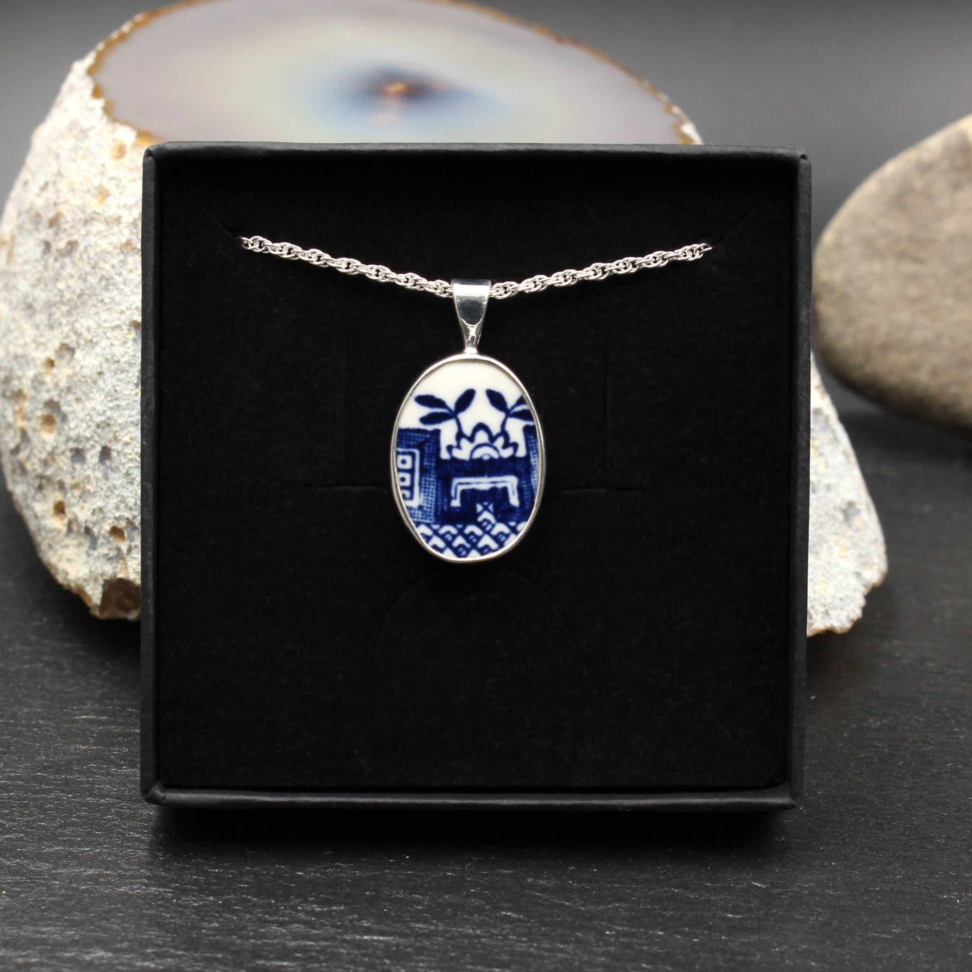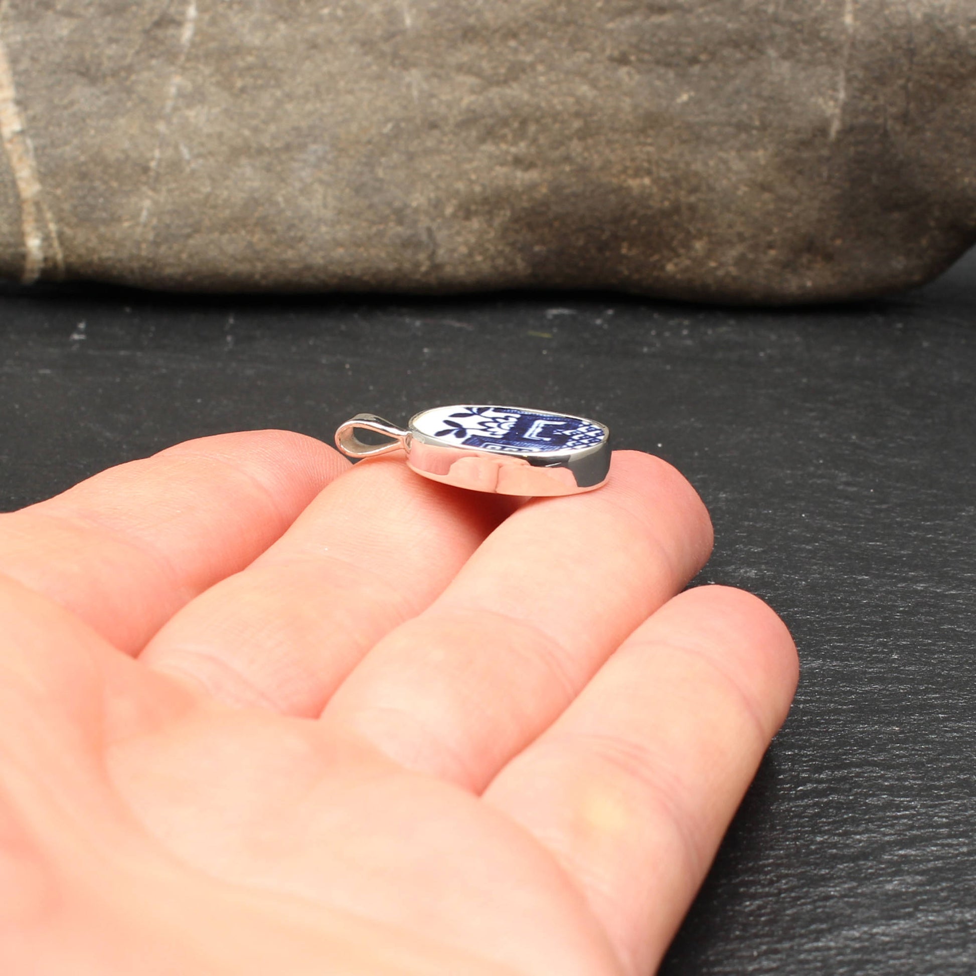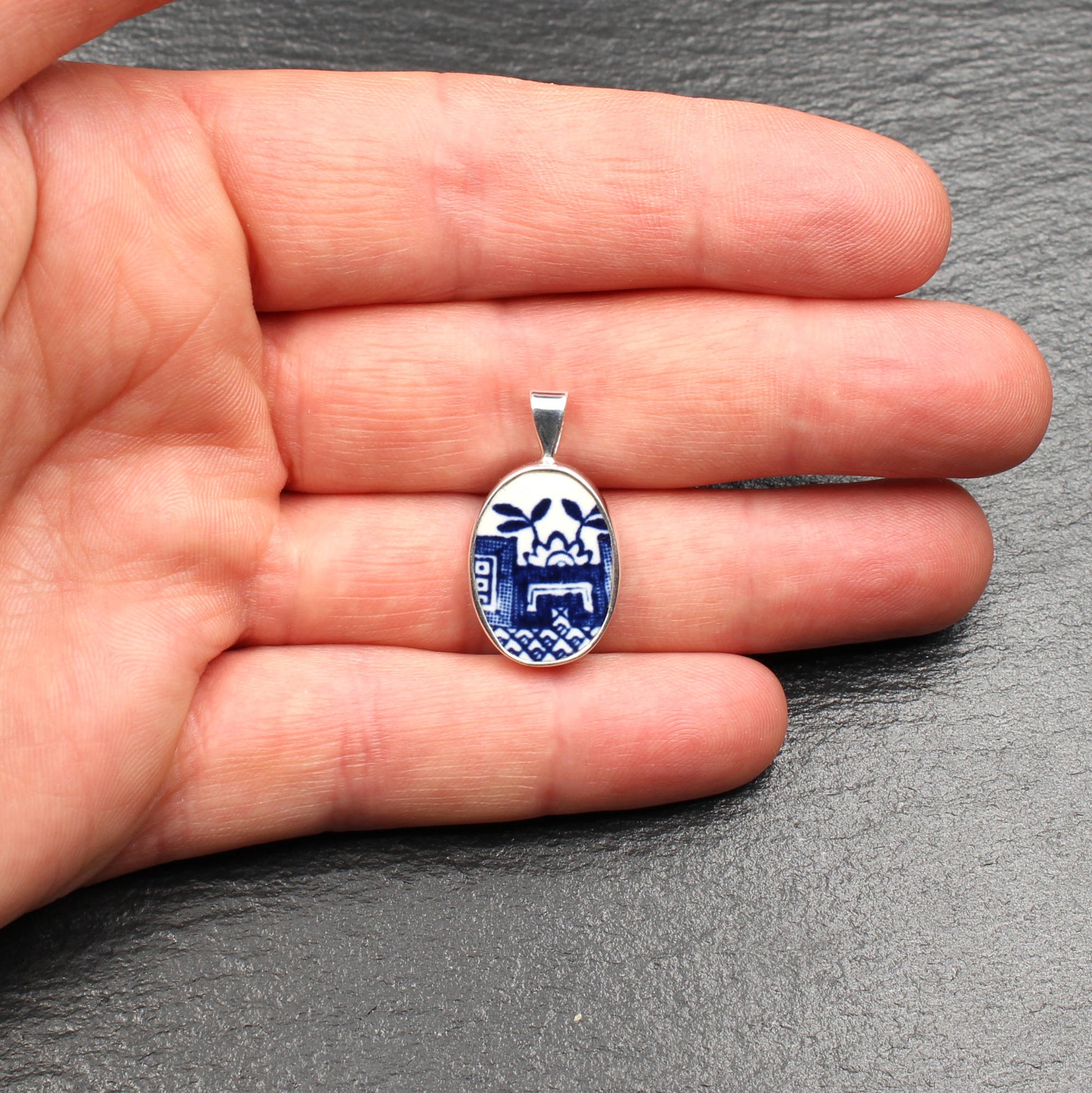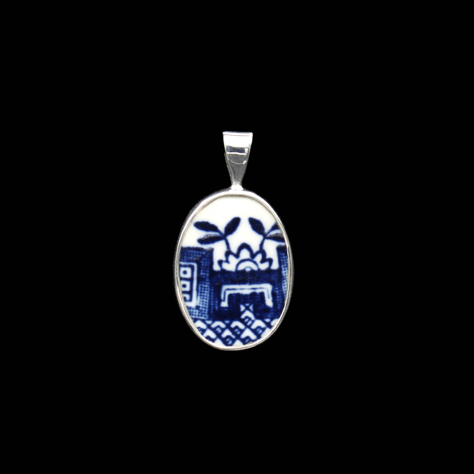 Anhänger aus 925 Sterlingsilber und englischem Porzellan des "Old Willow" Musters.