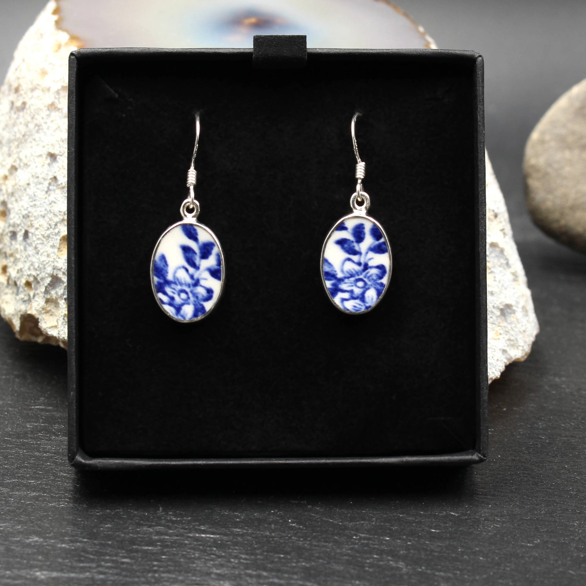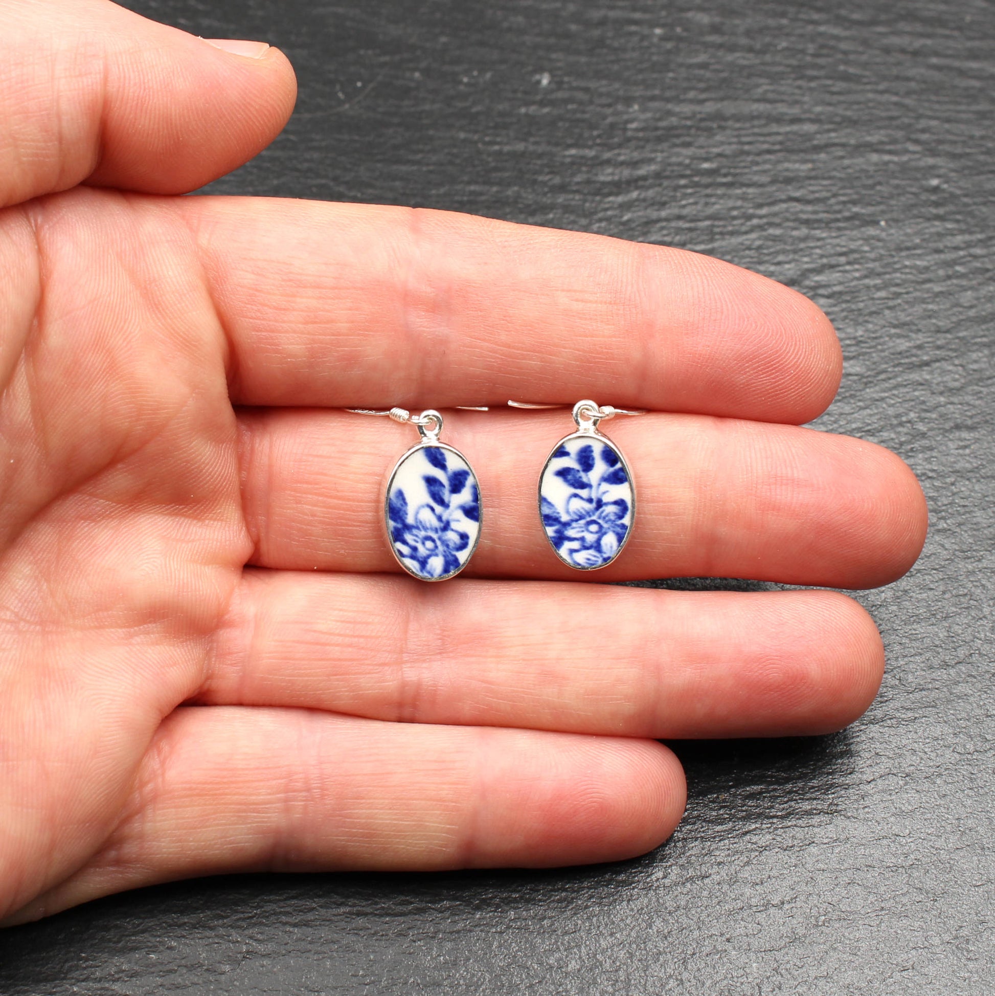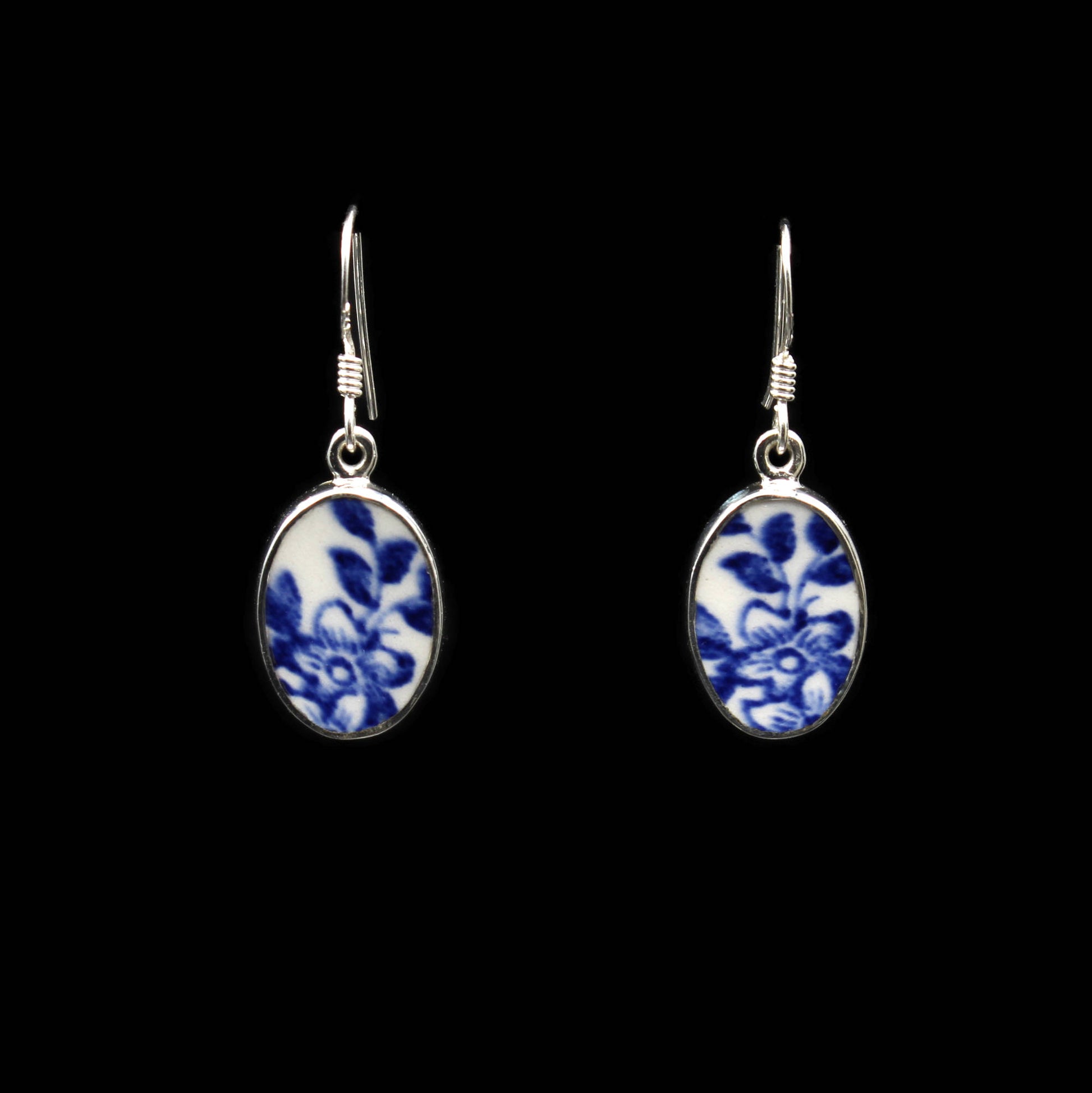 Oval Ohrringe aus 925 Sterlingsilber und englischem Porzellan des "Old Willow" Musters.