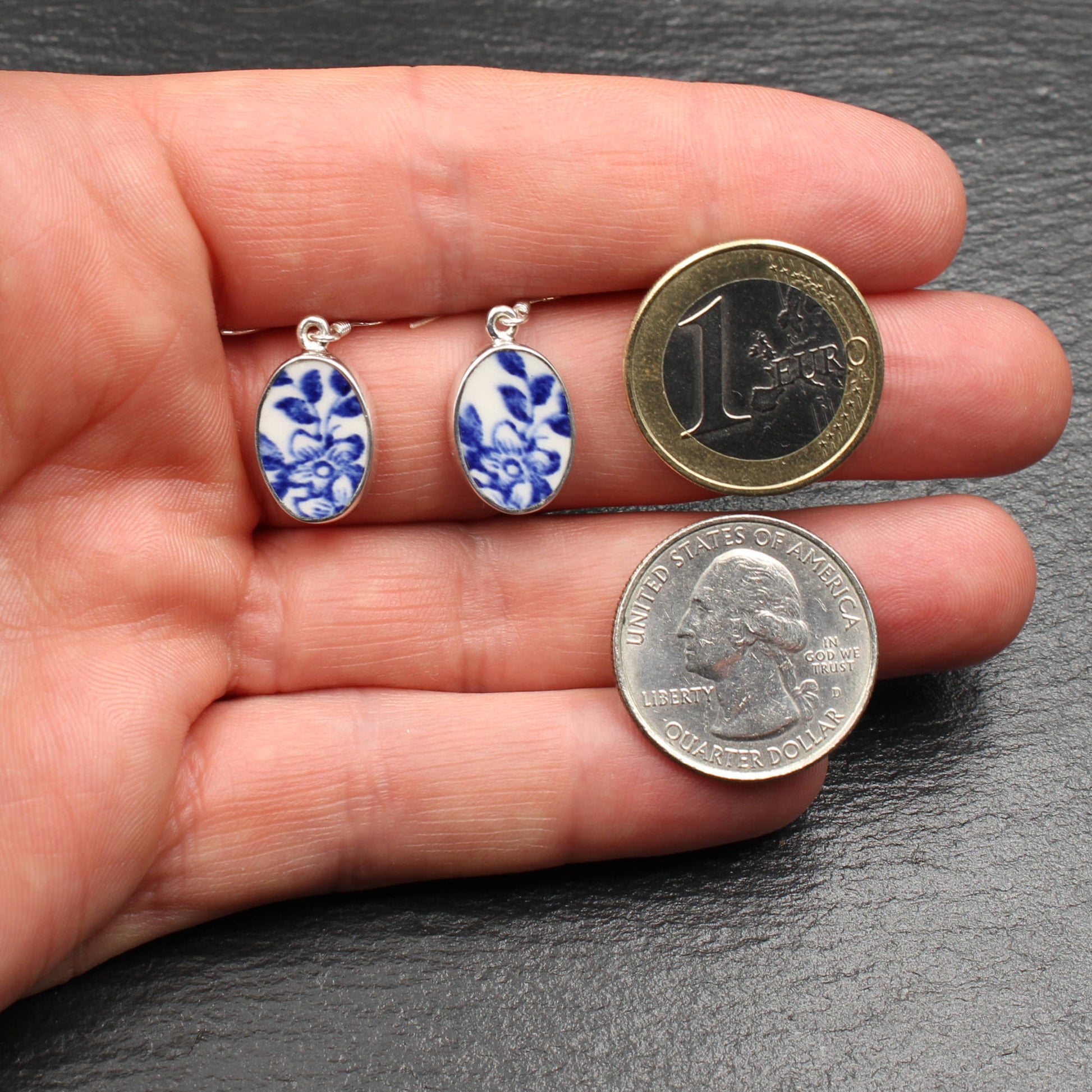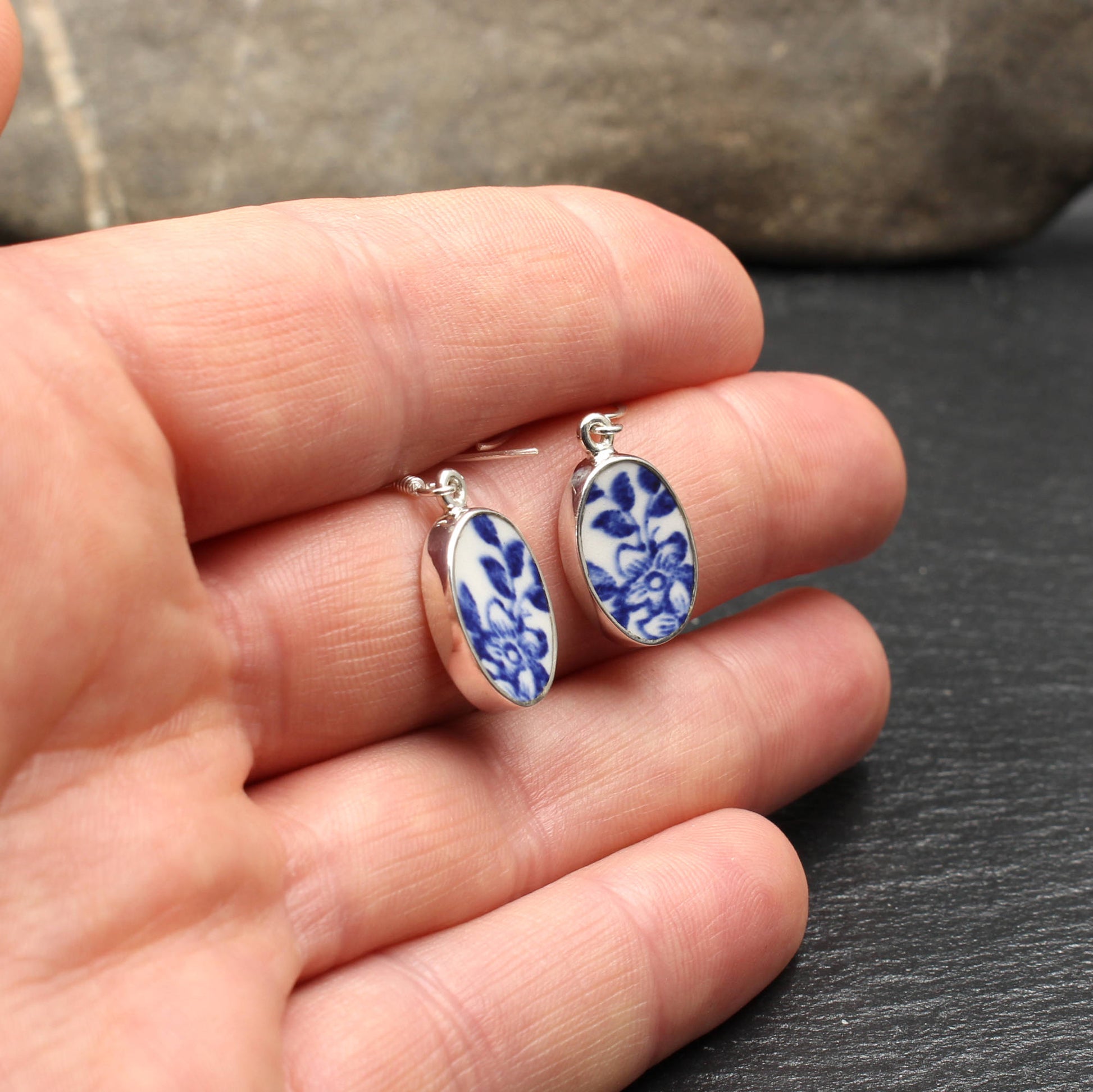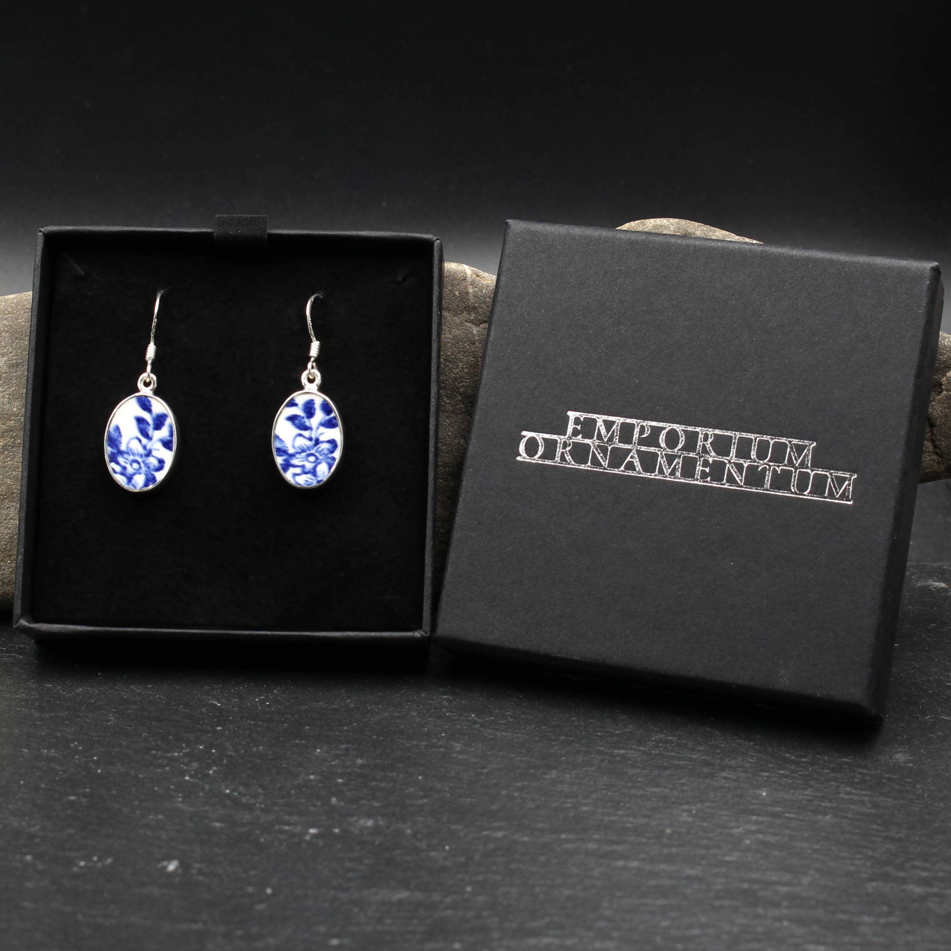 Oval Ohrringe aus 925 Sterlingsilber und englischem Porzellan des "Old Willow" Musters.