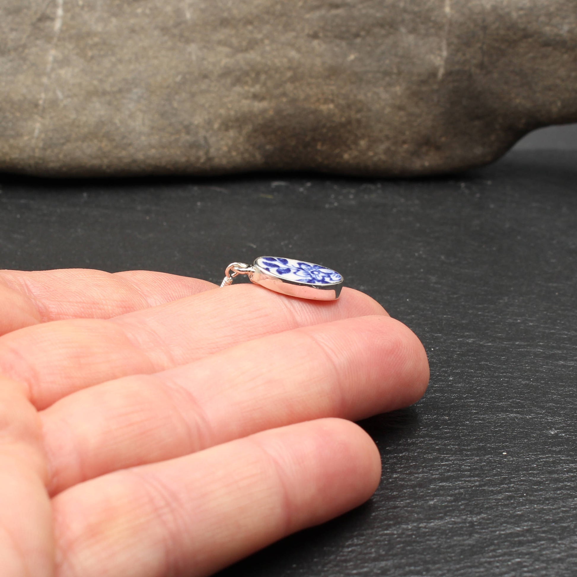Jedes Schmuckstück wird von Hand aus altem Porzellan hergestellt und in Silber gefasst.