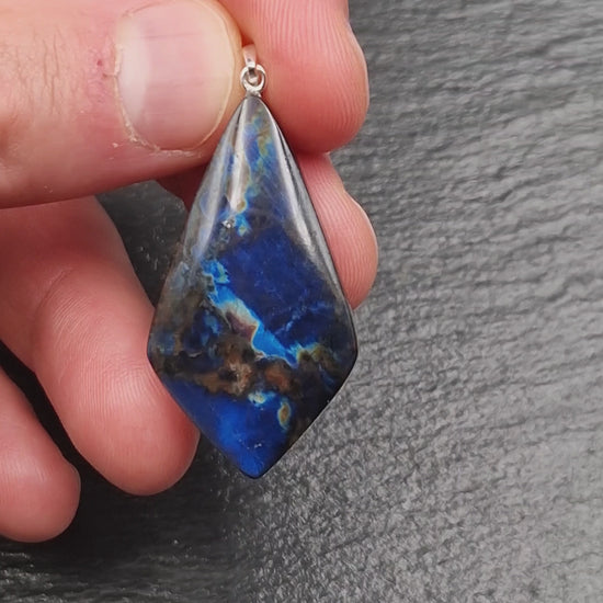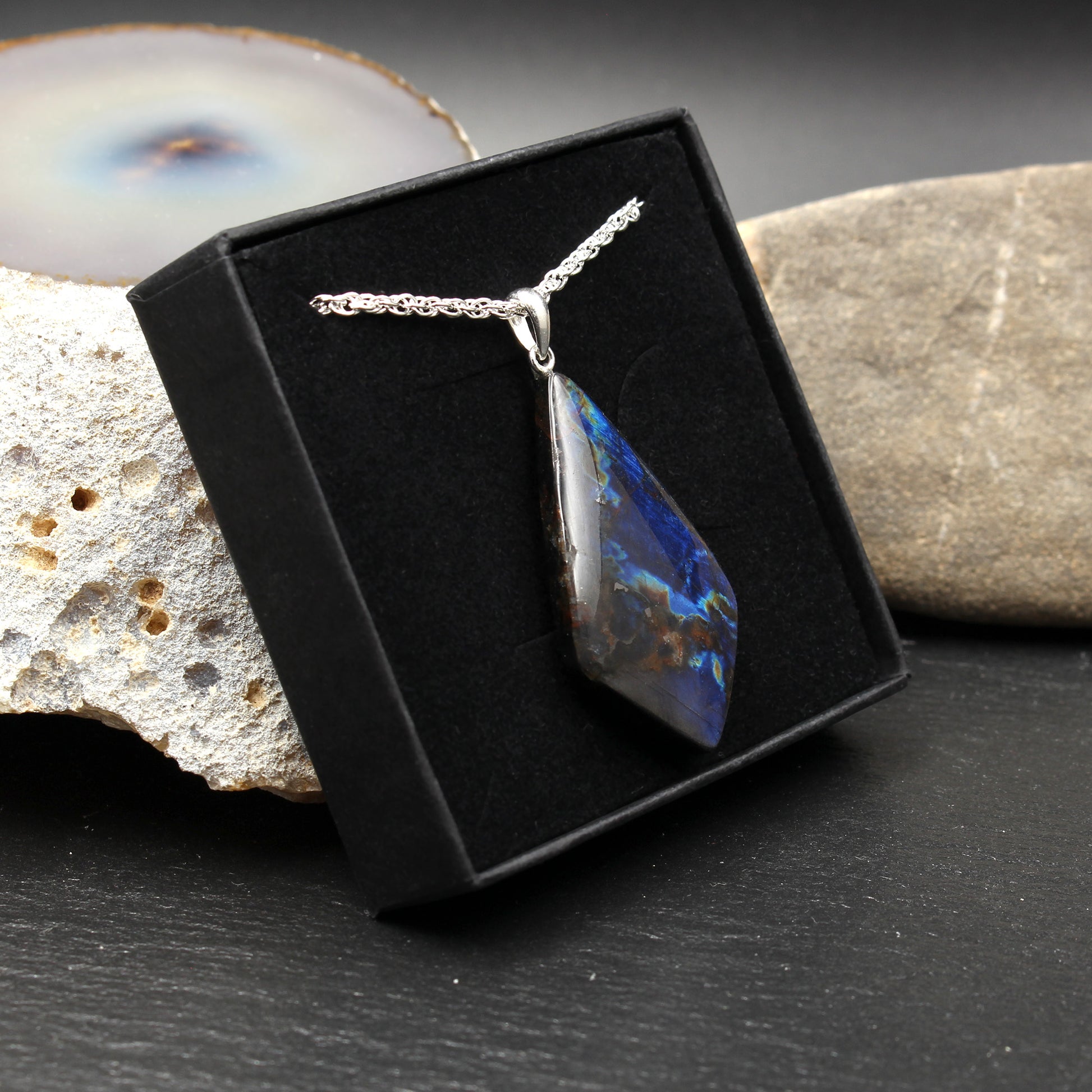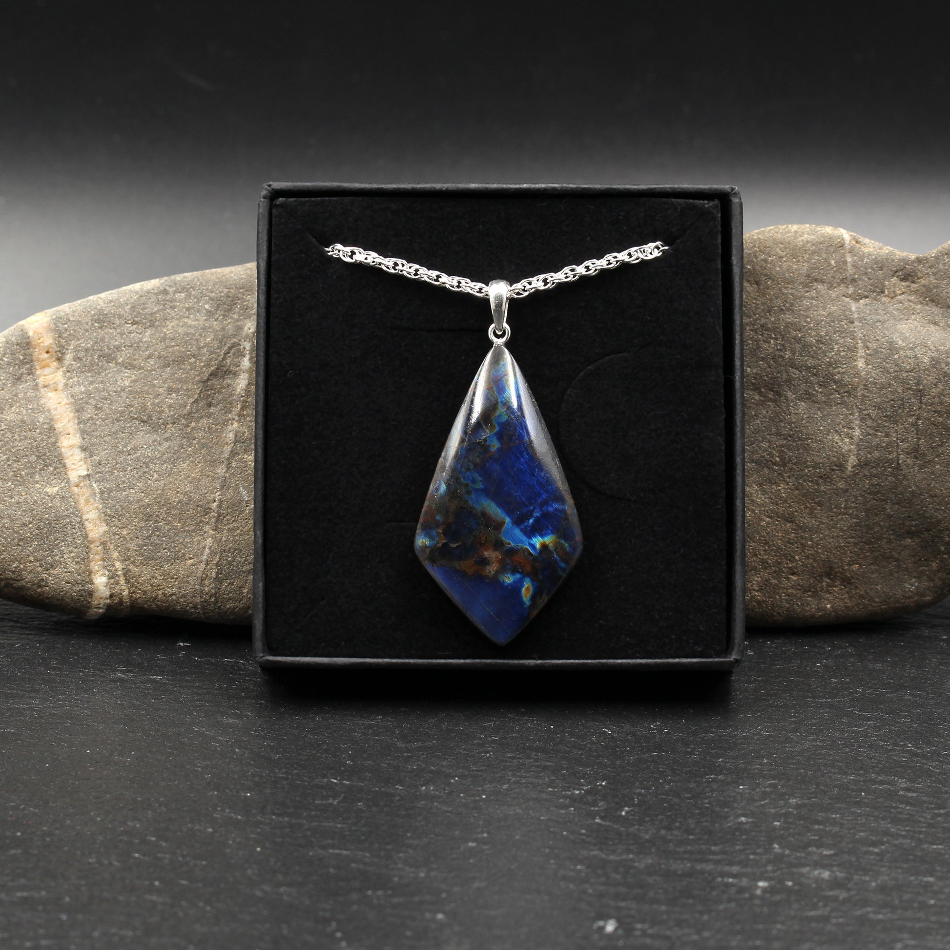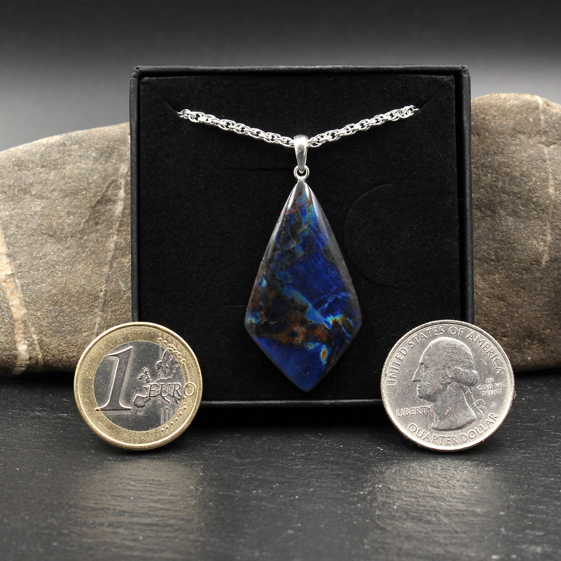 Verleihe deinem Outfit eine besondere Note mit diesem wunderschönen Anhänger aus finnischem Spektrolith. Der auf Hochglanz polierte Spektrolith, mit seinen schimmernden Blau- und Grüntönen ist ein echter Blickfang.