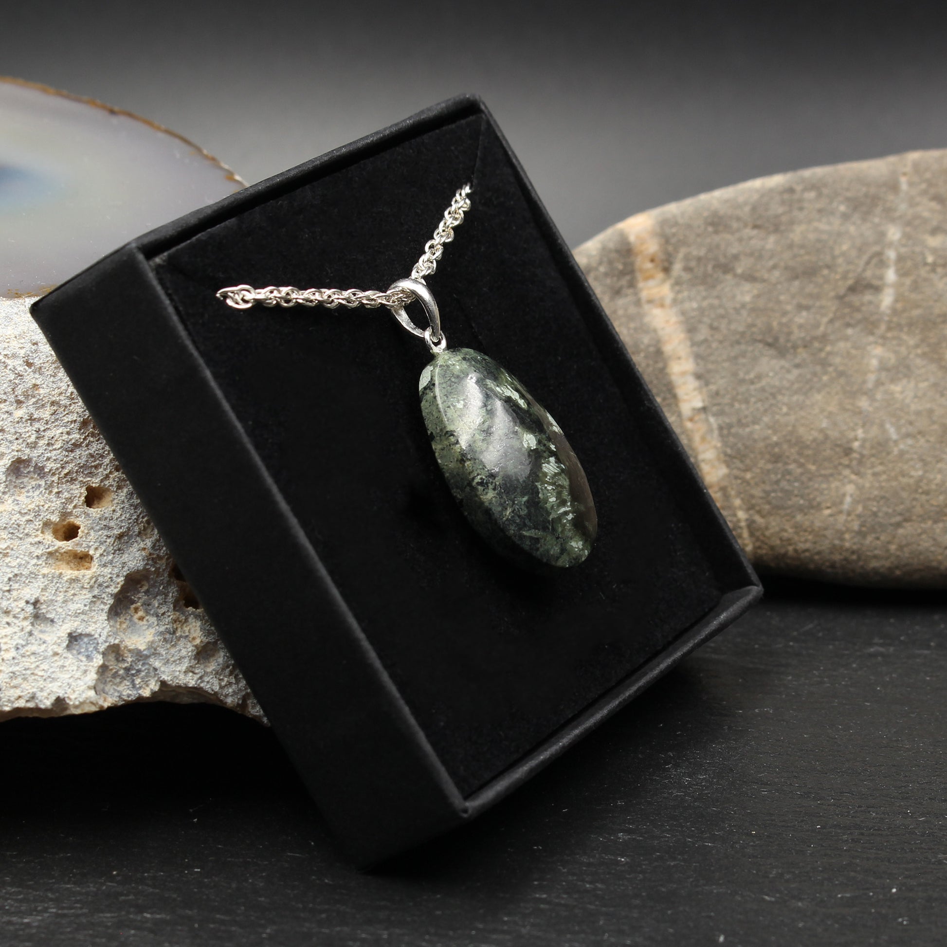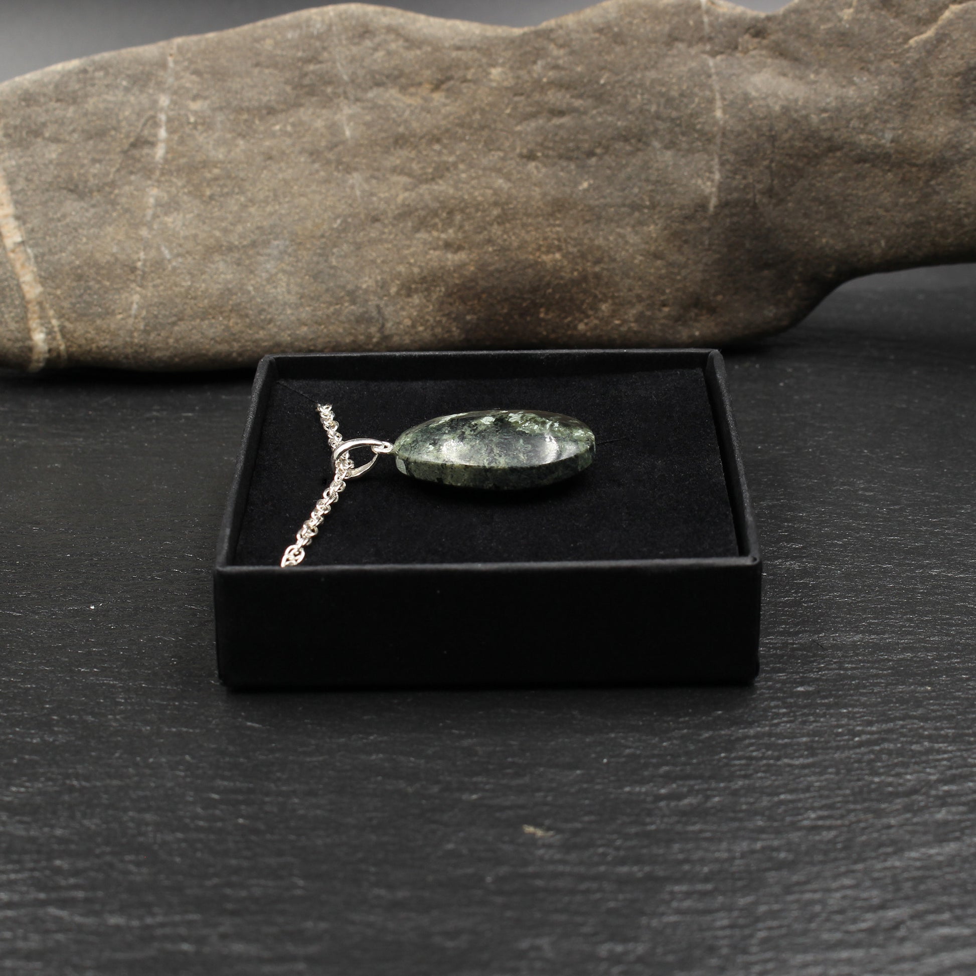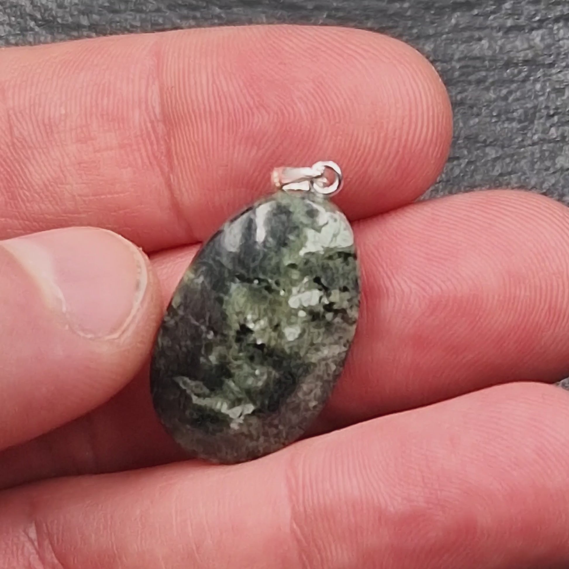 Handgefertigter Anhänger aus bayrischem Serpentinit, einem Gestein, das vor etwa 20.000 Jahren durch den eiszeitlichen Inngletscher ins Alpenvorland transportiert wurde.