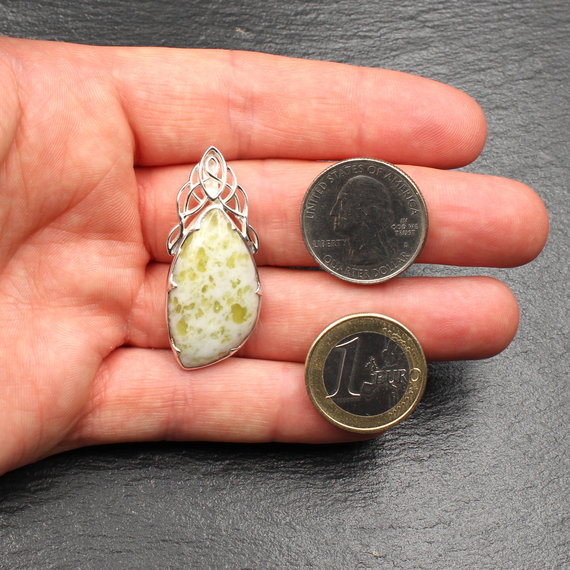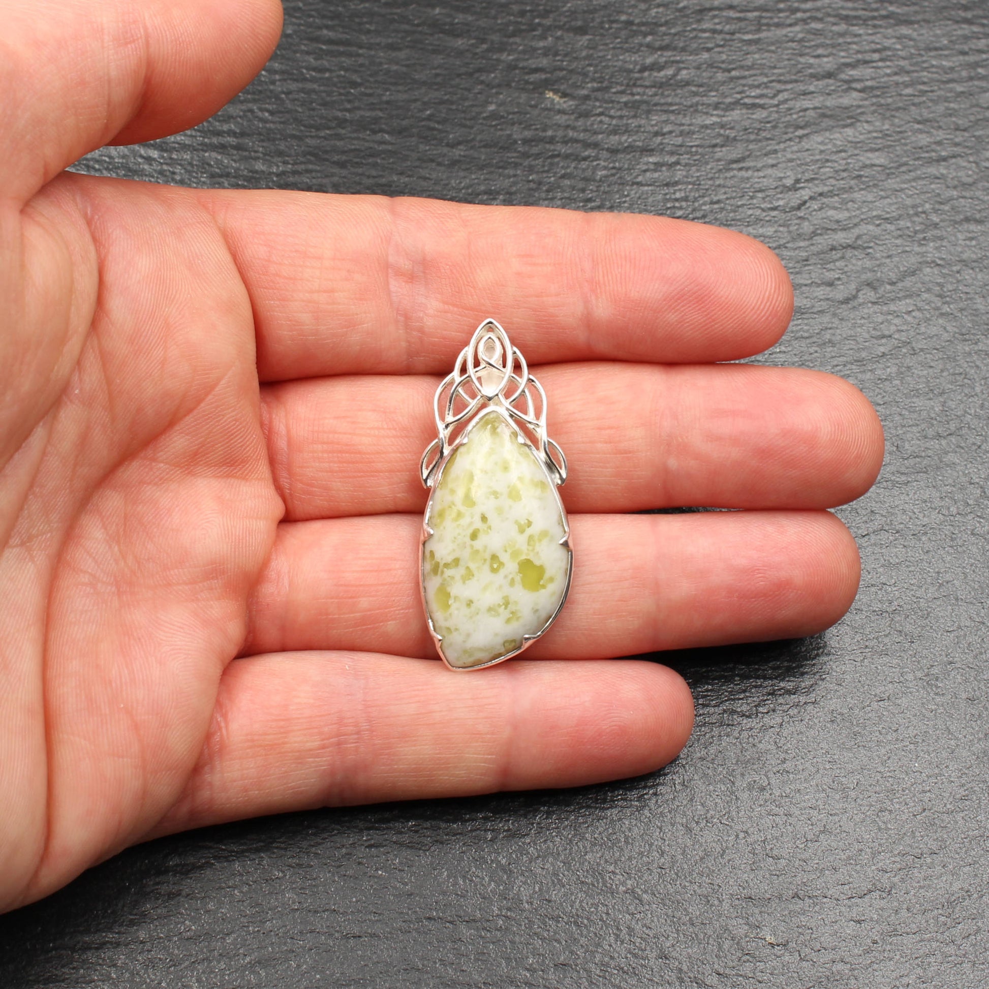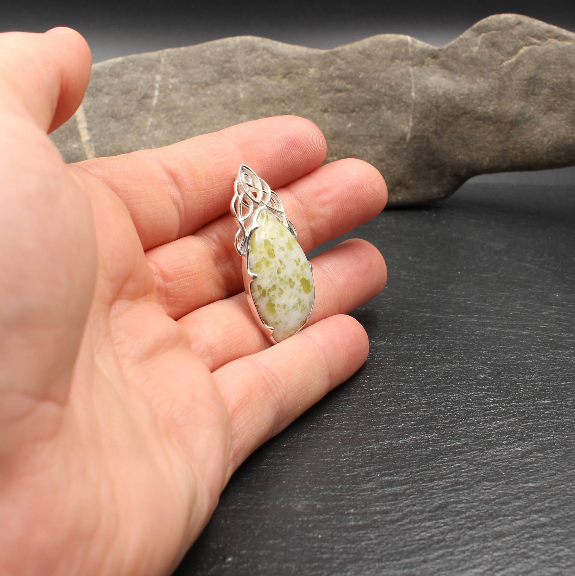 Wunderbar filigran gearbeiteter Anhänger aus Sterlingsilber und schottischem Iona Marmor im keltischen Design.