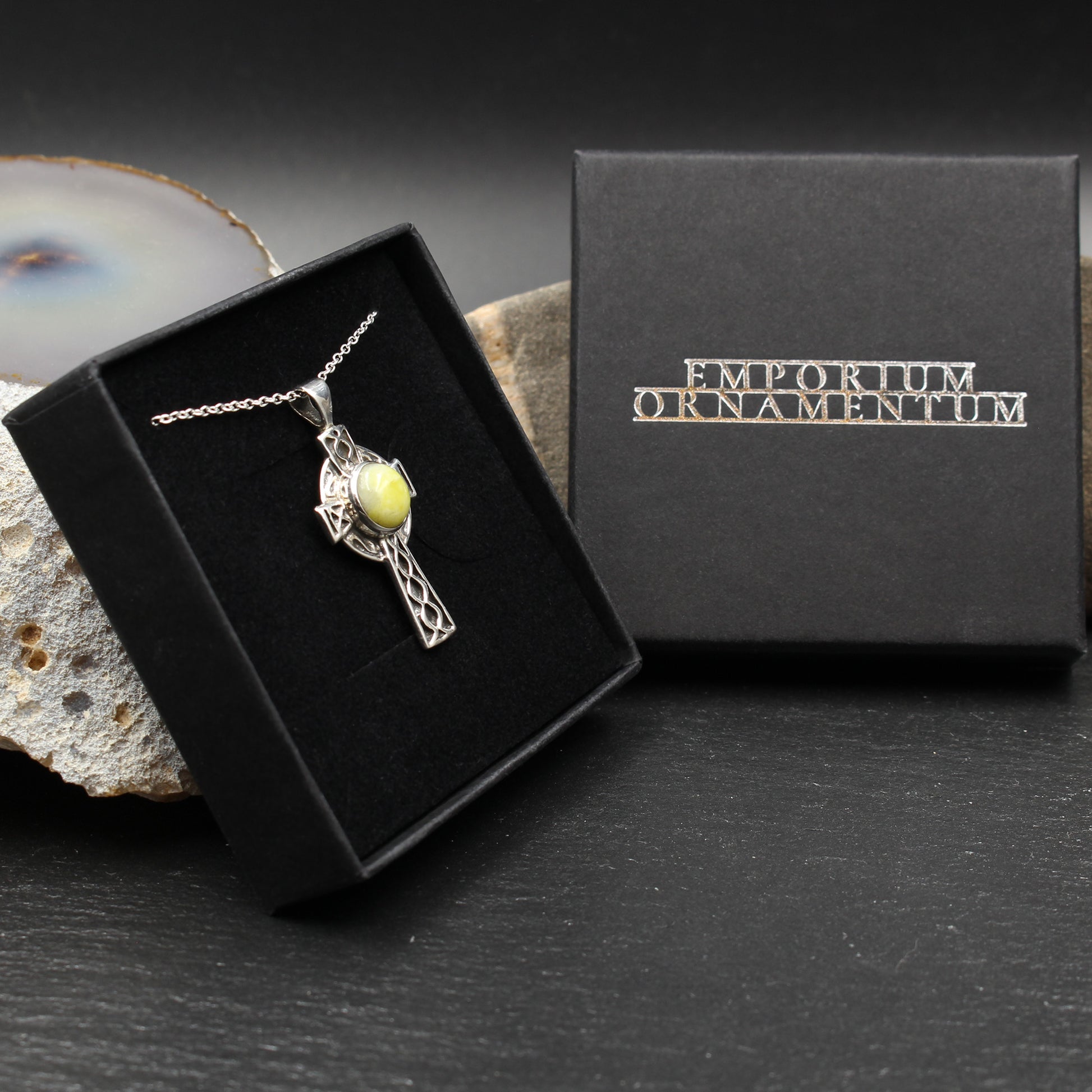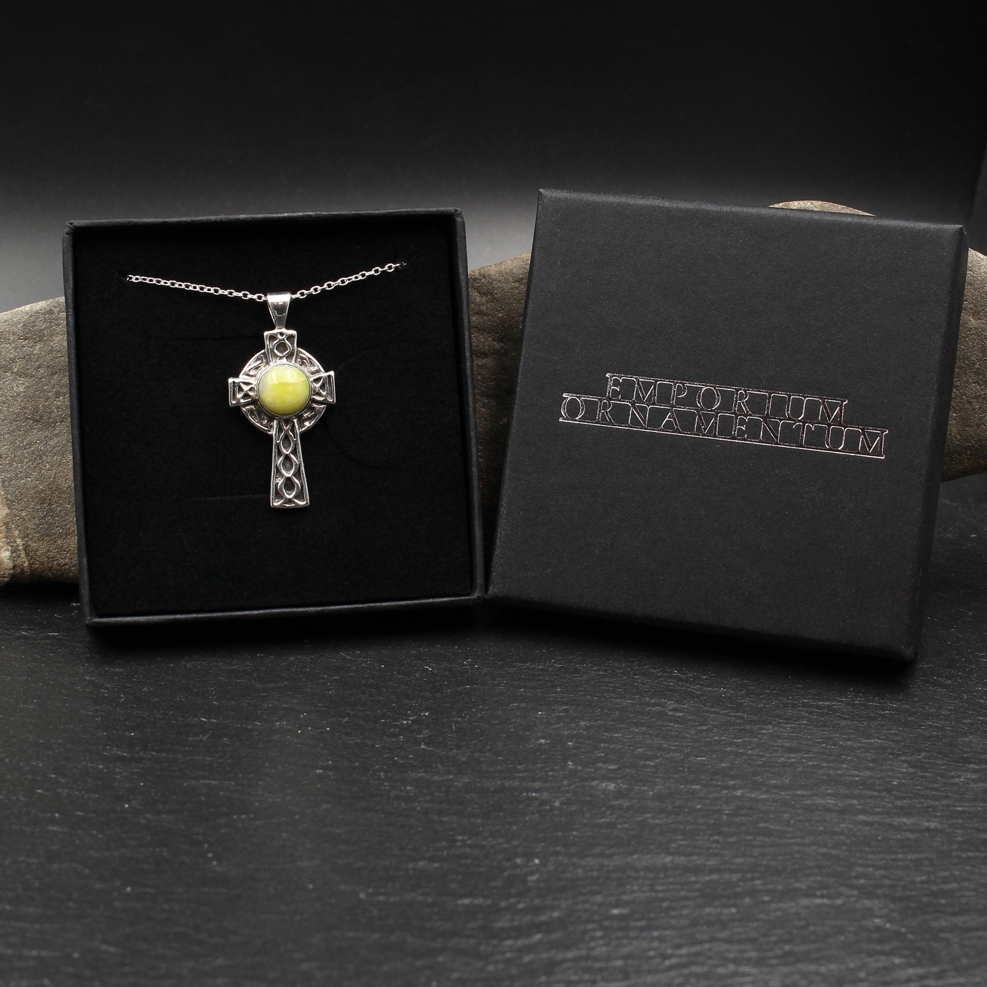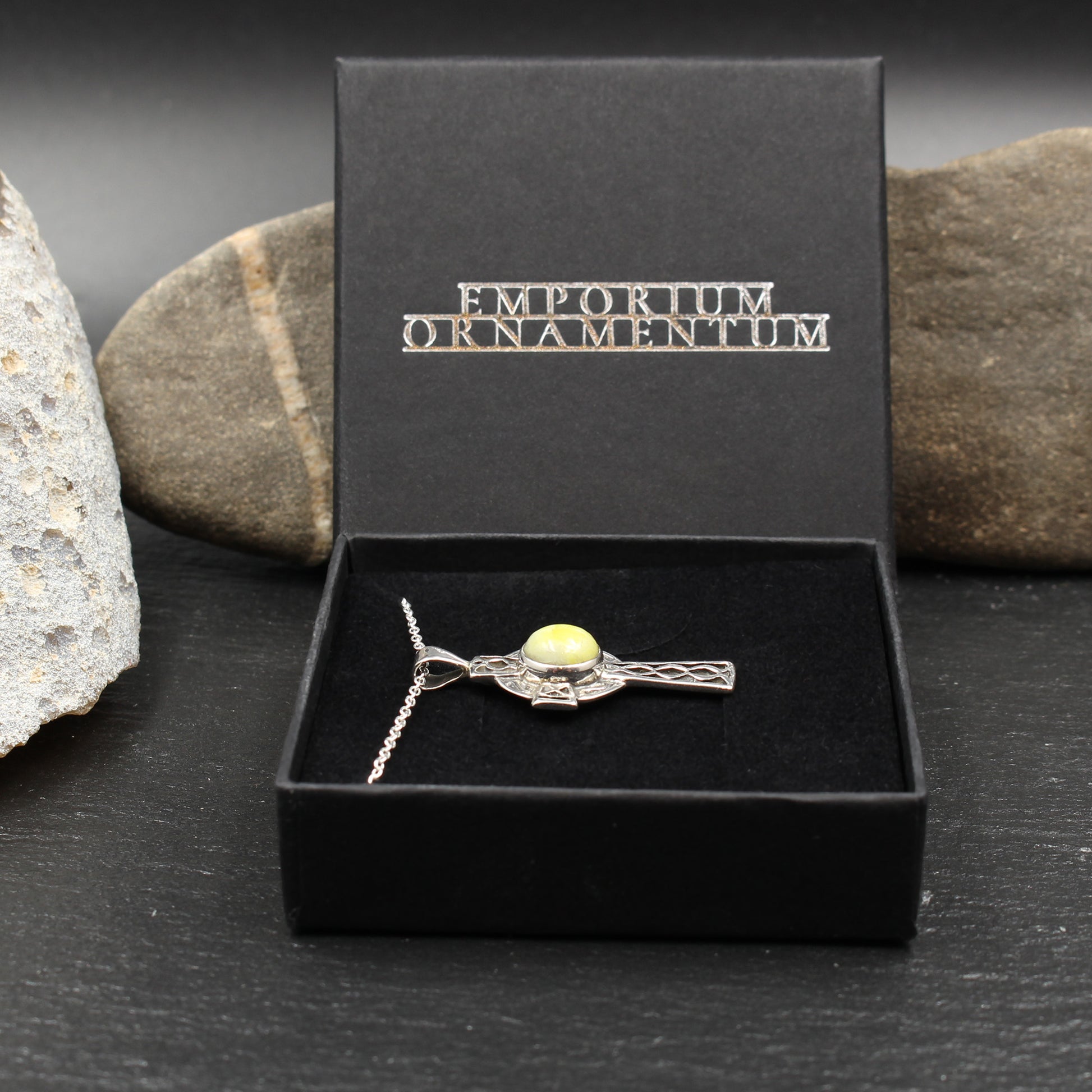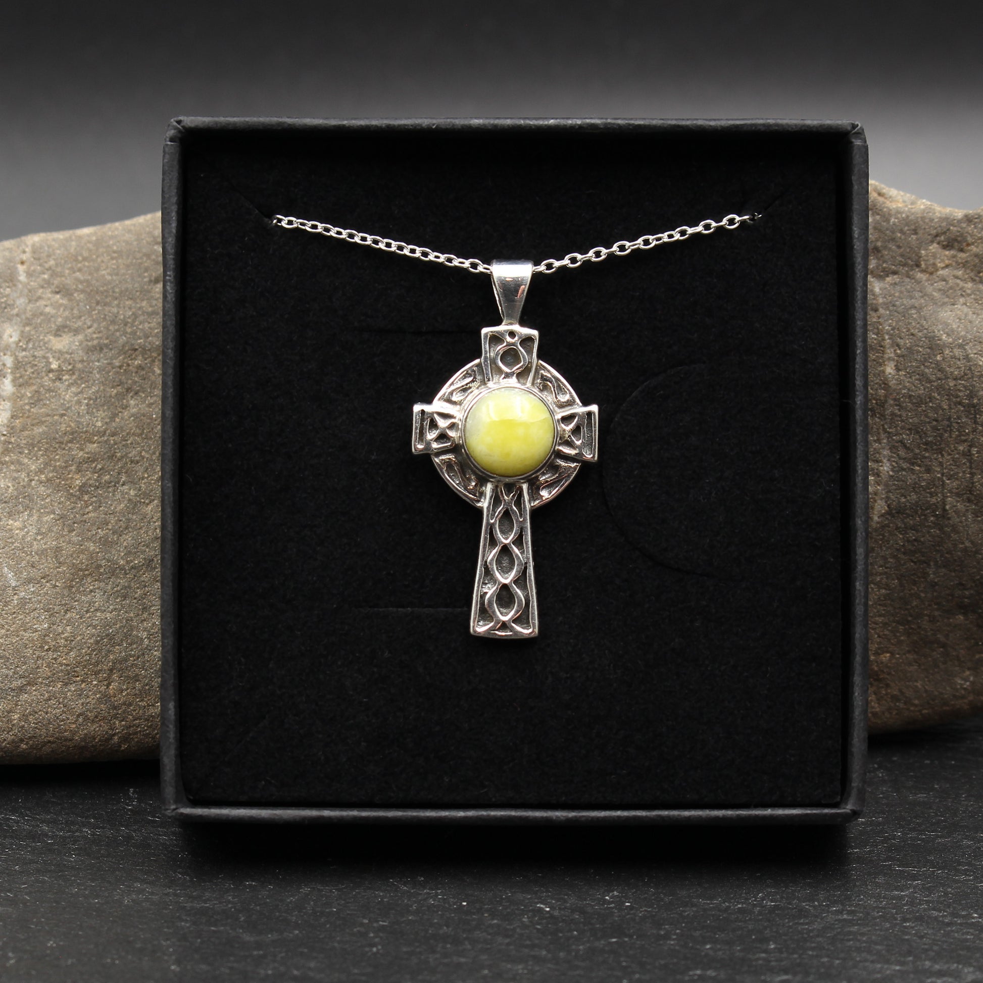 Anhänger aus Sterlingsilber im Keltenkreuz Design mit schottischem Highland Marmor. Das Design dieses Anhängers ist dem Keltenkreuz, auch Hochkreuz oder irisches Kreuz genannt, nachempfunden. Diese Form des Kreuzes ist vorallem im Raum der britischen Inseln, vorallem in Irland und Schottland vorzufinden und stammt aus der frühmittelalterlichen Zeit.
